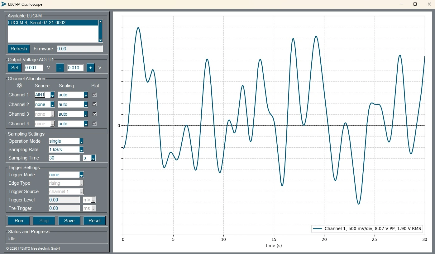 Die Datenerfassung ist grundsätzlich mit allen Verstärkern und Fotoempfängern möglich, entweder direkt über die Pins der D-Sub Buchse oder extern über die BNC-Eingänge des LUCI-M. Aufgrund der analogen Bandbreite von 1,1 MHz und der Samplerate von 2,5 MS/s ist jedoch bei Verstärkern und Fotoempfängern mit höheren Bandbreiten die Datenerfassung auf etwa 1 MHz begrenzt.