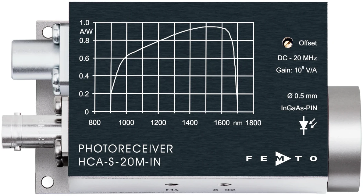 The HCA-S-20M photoreceiver combines a fast photodiode with the proven and outstanding FEMTO HCA current amplifier technology. It is available with InGaAs photodiode covering a spectral range from 900 to 1700 nm. The electrical amplifier gain is 1 x 105 V/A resulting in a maximum conversion gain of 9.5 x 104 V/W at 1550 nm. The sophisticated DC coupled multistage amplifier design allows measurements from DC to a maximum bandwidth of 20 MHz corresponding to a minimum rise time of 17.5 ns. With a noise equivalent power (NEP) as low as 3.5 pW/√Hz signals with an optical power in the micro Watt range can be detected without the need for further averaging.