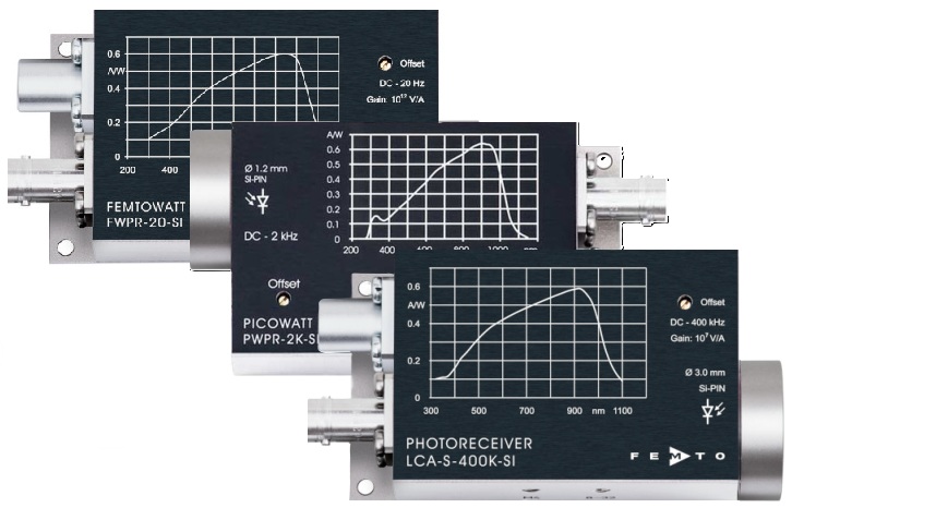 The photodetectors of the OE-200 series consist of Si-PIN or InGaAs-PIN photodiodes and switchable very low-noise transimpedance amplifiers for converting small optical signals into proportional output voltages. They have switchable gains and are optimised for maximum gain.