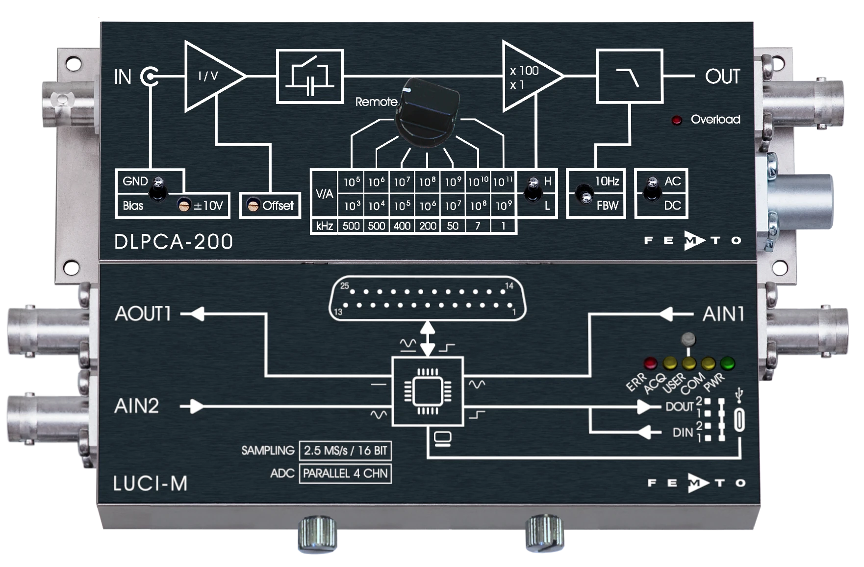 Das LUCI-M System eignet sich zur Fernsteuerung aller FEMTO-Verstärker und Fotoempfänger mit einer 25-poligen D-Sub Buchse. Abhängig vom verwendeten Verstärker oder Fotoempfänger können alle wichtigen Funktionen wie zum Beispiel Verstärkung, AC/DC-Umschaltung oder Filtereinstellungen ferngesteuert werden. Zusätzlich können Statusinformationen wie „overload“ oder „unlocked“ abgefragt werden.